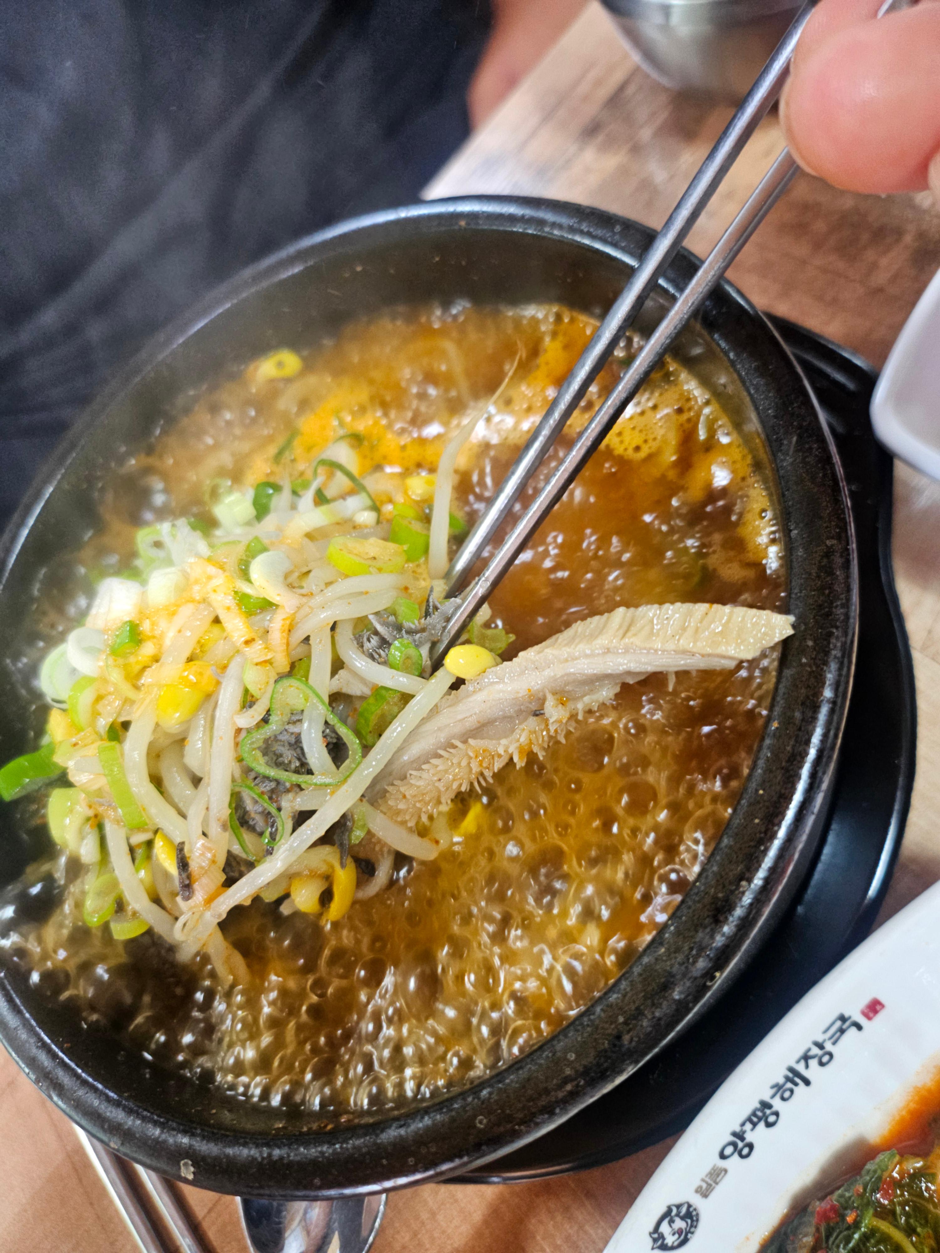 양평해장국 특유의 구수한 국물과 선홍빛 매콤함이 조화롭게 어우러져,